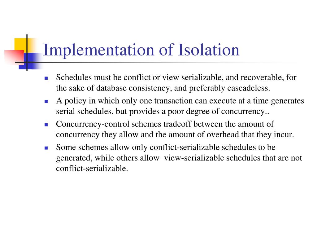 Implementation of Isolation • Schedules must be conflict or view serializable, and recoverable, for the sake of database consistency, and preferably cascadeless. • A policy in which only one transaction can execute at a time generates serial schedules, but provides a poor degree of concurrency.. • Concurrency-control schemes tradeoff between the amount of concurrency they allow and the amount of overhead that they incur. • Some schemes allow only conflict-serializable schedules to be generated, while others allow view-serializable schedules that are not conflict-serializable.
