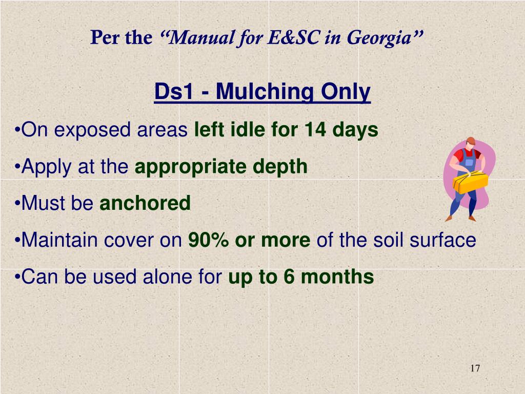 Per the “Manual for E&SC in Georgia” • Ds1 - Mulching Only • On exposed areasleft idle for 14 days • Apply at theappropriate depth • Must beanchored • Maintain cover on90% or moreof the soil surface • Can be used alone forup to 6 months