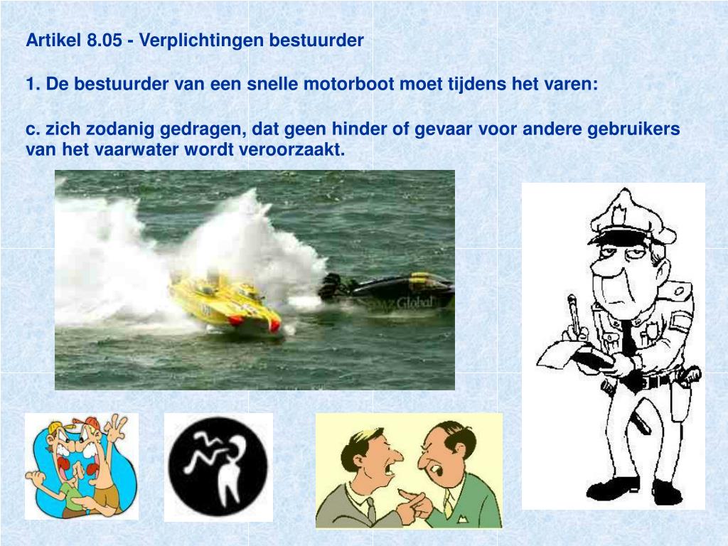Artikel 8.05 - Verplichtingen bestuurder2. De bestuurder draagt er zorg voor dat de motor van een snelle motorboot geen onnodige geluidhinder veroorzaakt.3. De bestuurder draagt er zorg voor dat de motor van een stilliggende snelle motorboot niet onnodig lang of zonder redelijk doel in werking wordt gehouden.