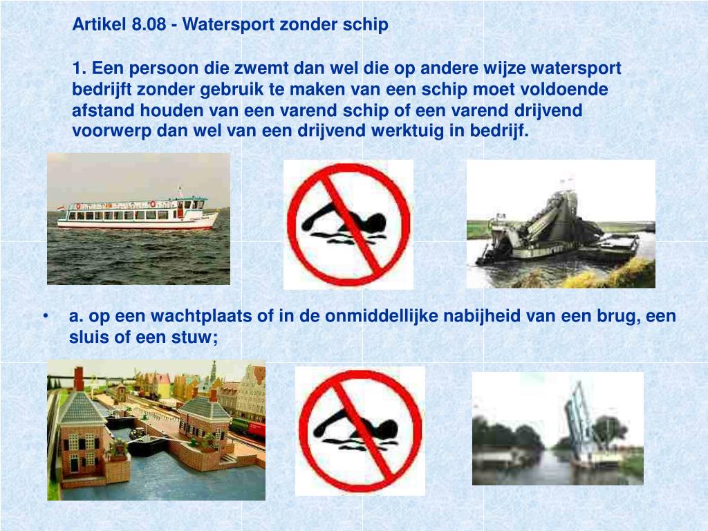 Artikel 8.08 - Watersport zonder schip1. Een persoon die zwemt dan wel die op andere wijze watersport bedrijft zonder gebruik te maken van een schip moet voldoende afstand houden van een varend schip of een varend drijvend voorwerp dan wel van een drijvend werktuig in bedrijf. • a. op een wachtplaats of in de onmiddellijke nabijheid van een brug, een sluis of een stuw;