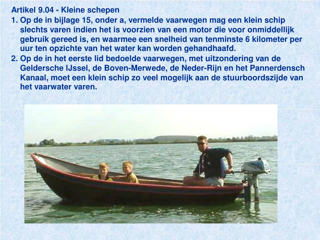 Artikel 9.04 - Kleine schepen1. Op de in bijlage 15, onder a, vermelde vaarwegen mag een klein schip slechts varen indien het is voorzien van een motor die voor onmiddellijk gebruik gereed is, en waarmee een snelheid van tenminste 6 kilometer per uur ten opzichte van het water kan worden gehandhaafd.2. Op de in het eerste lid bedoelde vaarwegen, met uitzondering van de Geldersche lJssel, de Boven-Merwede, de Neder-Rijn en het Pannerdensch Kanaal, moet een klein schip zo veel mogelijk aan de stuurboordszijde van het vaarwater varen.