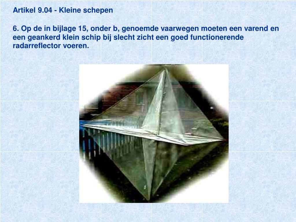 Artikel 9.04 - Kleine schepen6. Op de in bijlage 15, onder b, genoemde vaarwegen moeten een varend en een geankerd klein schip bij slecht zicht een goed functionerende radarreflector voeren.