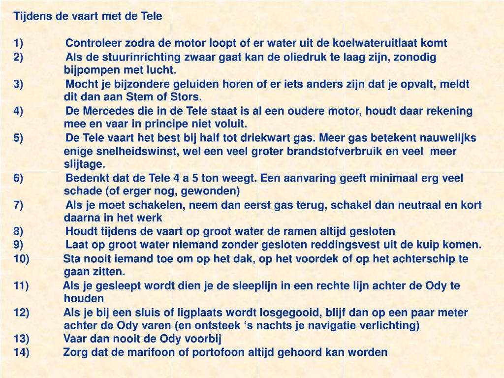 Tijdens de vaart met de Tele1)Controleer zodra de motor loopt of er water uit de koelwateruitlaat komt2)Als de stuurinrichting zwaar gaat kan de oliedruk te laag zijn, zonodig bijpompen met lucht.3)Mocht je bijzondere geluiden horen of er iets anders zijn dat je opvalt, meldt dit dan aan Stem of Stors.4)De Mercedes die in de Tele staat is al een oudere motor, houdt daar rekening mee en vaar in principe niet voluit.5)De Tele vaart het best bij half tot driekwart gas. Meer gas betekent nauwelijks enige snelheidswinst, wel een veel groter brandstofverbruik en veel meer slijtage.6)Bedenkt dat de Tele 4 a 5 ton weegt. Een aanvaring geeft minimaal erg veel schade (of erger nog, gewonden)7)Als je moet schakelen, neem dan eerst gas terug, schakel dan neutraal en kort daarna in het werk8)Houdt tijdens de vaart op groot water de ramen altijd gesloten9)Laat op groot water niemand zonder gesloten reddingsvest uit de kuip komen.10)Sta nooit iemand toe om op het dak, op het voordek of op het achterschip te gaan zitten.11)Als je gesleept wordt dien je de sleeplijn in een rechte lijn achter de Ody te houden12)Als je bij een sluis of ligplaats wordt losgegooid, blijf dan op een paar meter achter de Ody varen (en ontsteek ‘s nachts je navigatie verlichting)13)Vaar dan nooit de Ody voorbij14)Zorg dat de marifoon of portofoon altijd gehoord kan worden
