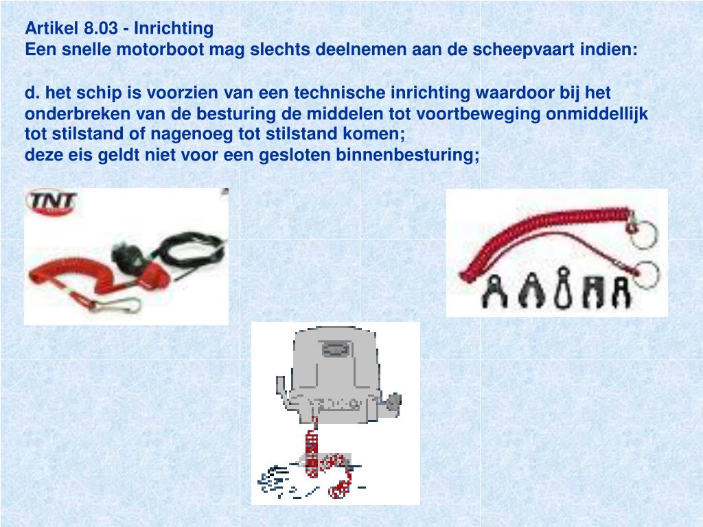 Artikel 8.03 - InrichtingEen snelle motorboot mag slechts deelnemen aan de scheepvaart indien:d. het schip is voorzien van een technische inrichting waardoor bij het onderbreken van de besturing de middelen tot voortbeweging onmiddellijk tot stilstand of nagenoeg tot stilstand komen;deze eis geldt niet voor een gesloten binnenbesturing;