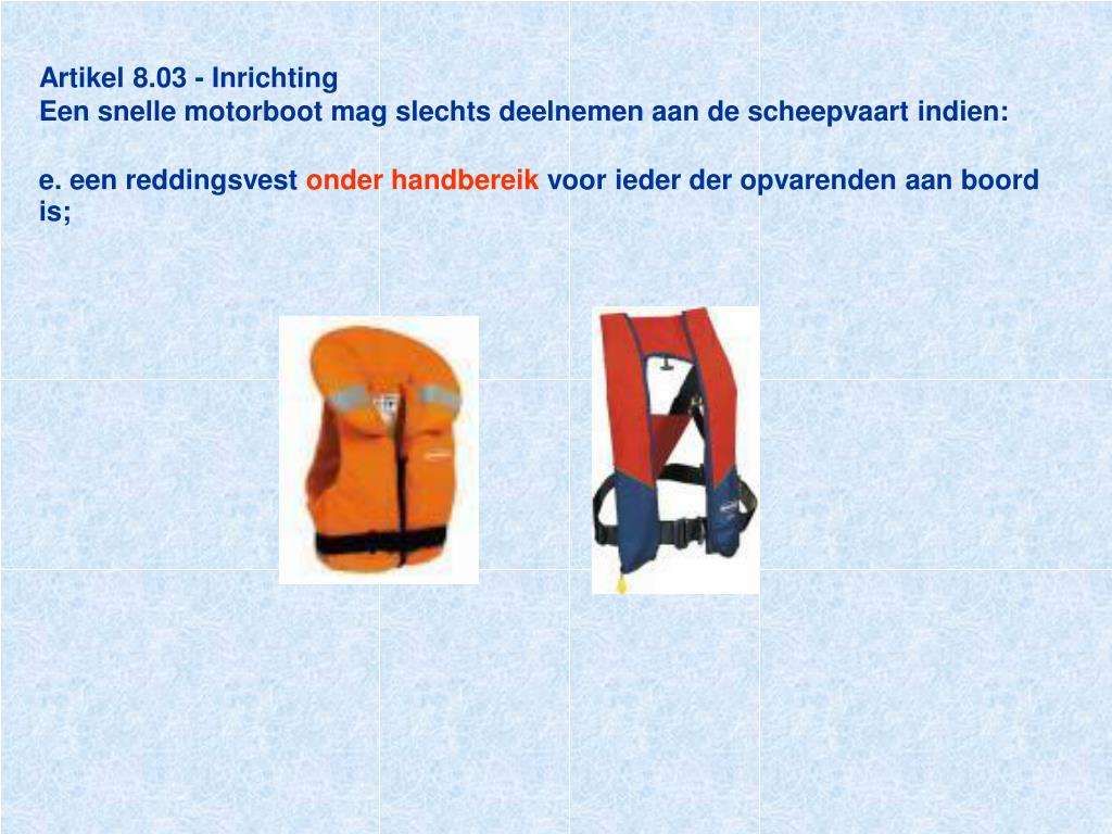 Artikel 8.03 - InrichtingEen snelle motorboot mag slechts deelnemen aan de scheepvaart indien:e. een reddingsvestonder handbereikvoor ieder der opvarenden aan boord is;