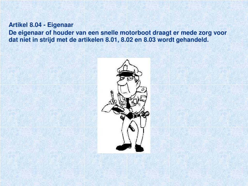 Artikel 8.04 - EigenaarDe eigenaar of houder van een snelle motorboot draagt er mede zorg voor dat niet in strijd met de artikelen 8.01, 8.02 en 8.03 wordt gehandeld.