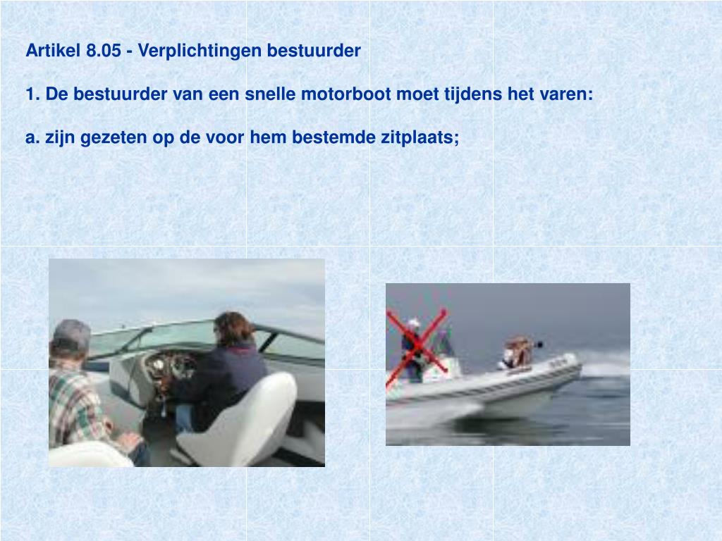 Artikel 8.05 - Verplichtingen bestuurder1. De bestuurder van een snelle motorboot moet tijdens het varen:a. zijn gezeten op de voor hem bestemde zitplaats;