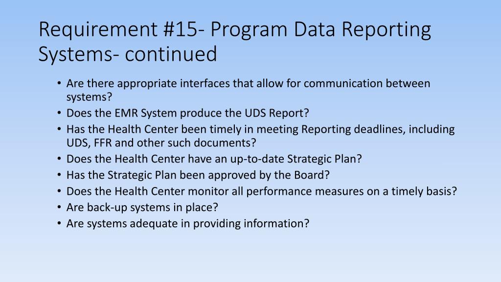 Requirement #15- Program Data Reporting Systems- continued • Are there appropriate interfaces that allow for communication between systems? • Does the EMR System produce the UDS Report? • Has the Health Center been timely in meeting Reporting deadlines, including UDS, FFR and other such documents? • Does the Health Center have an up-to-date Strategic Plan? • Has the Strategic Plan been approved by the Board? • Does the Health Center monitor all performance measures on a timely basis? • Are back-up systems in place? • Are systems adequate in providing information?