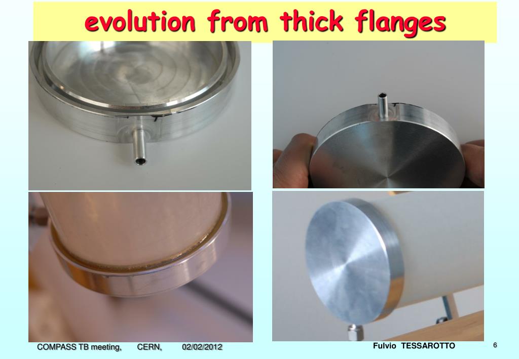 Production of the thin tubes • November 2011: production of “final size prototypes” from Lamina failed • they refused to deliver the tubes because of “bubble problems” • R&D at Lamina; modification in the production procedure introduced • shorter prototypes (L = 1m) produced and shipped to Trieste • December 2011: test of the shorter prototypes with thick flanges • validation of the aluminized Mylar tubes ( leak ~ 1 ml/h ) • decision on the final material and order to proceed to production • January 2012: further improvement in the production procedure • 5 pipes produced and shipped to Trieste Fulvio TESSAROTTO