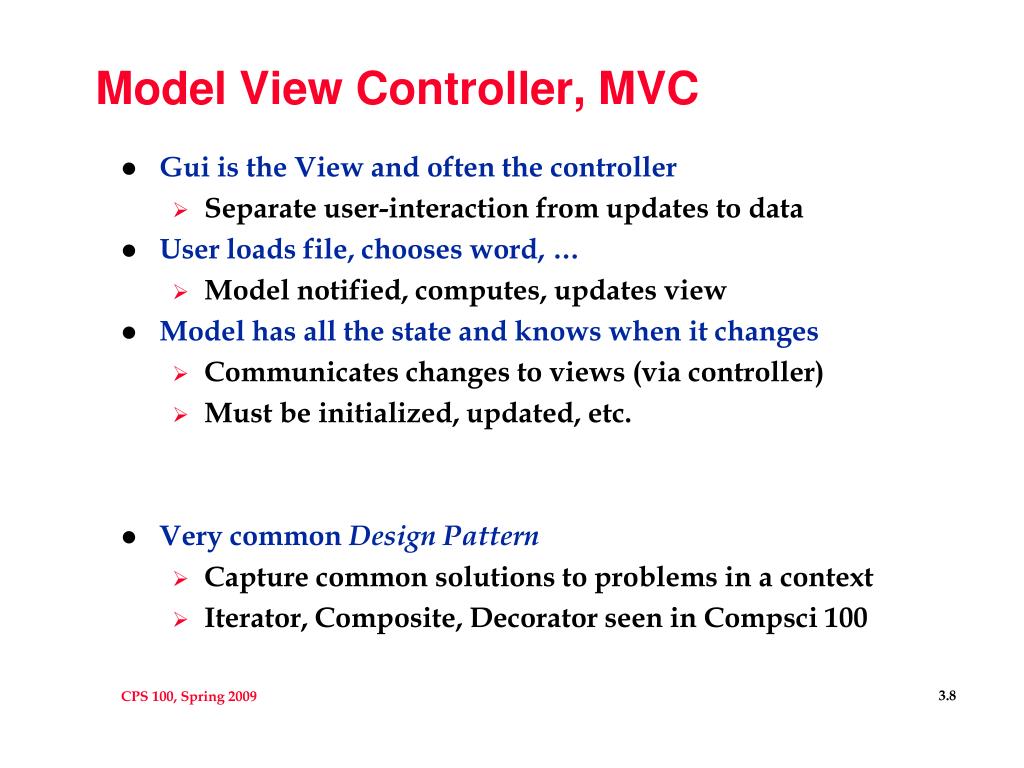 Model View Controller, MVC • Gui is the View and often the controller • Separate user-interaction from updates to data • User loads file, chooses word, … • Model notified, computes, updates view • Model has all the state and knows when it changes • Communicates changes to views (via controller) • Must be initialized, updated, etc. • Very common Design Pattern • Capture common solutions to problems in a context • Iterator, Composite, Decorator seen in Compsci 100