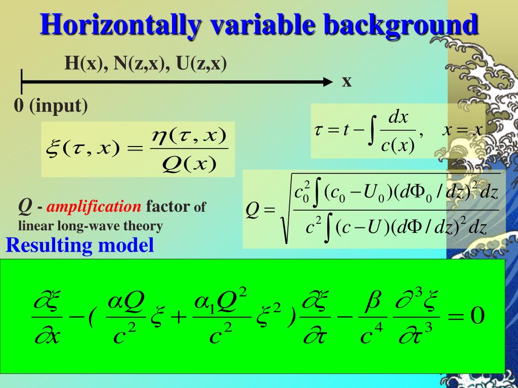 Horizontally variable background H(x), N(z,x), U(z,x) 0 (input) x Q- amplification factor of linear long-wave theory Resulting model