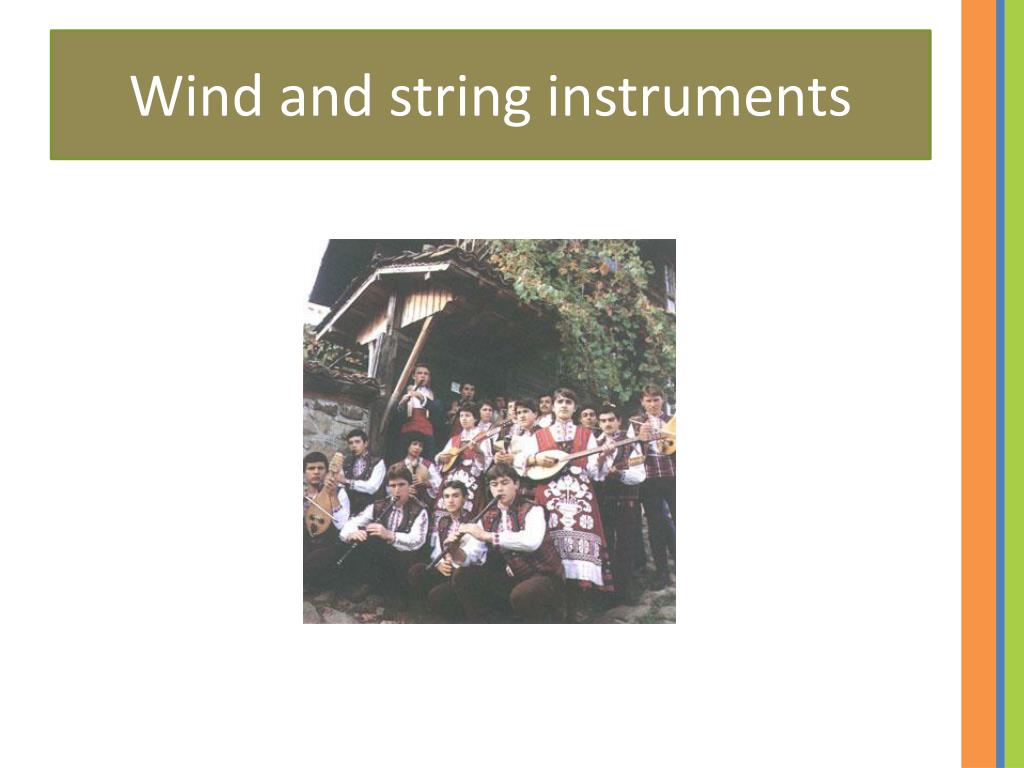 Overview Traditional Bulgarian musical instruments can be divided into three large groups: single and two voice wind instruments (pipe, shepherd's pipe or wooden flute /kaval/, bagpipe) string instruments (rebec, pandore), and percussion instruments (drum).
