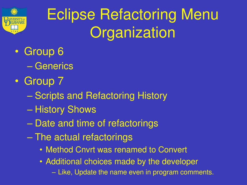 Eclipse Refactoring Menu Organization • Group 6 • Generics • Group 7 • Scripts and Refactoring History • History Shows • Date and time of refactorings • The actual refactorings • Method Cnvrt was renamed to Convert • Additional choices made by the developer • Like, Update the name even in program comments.