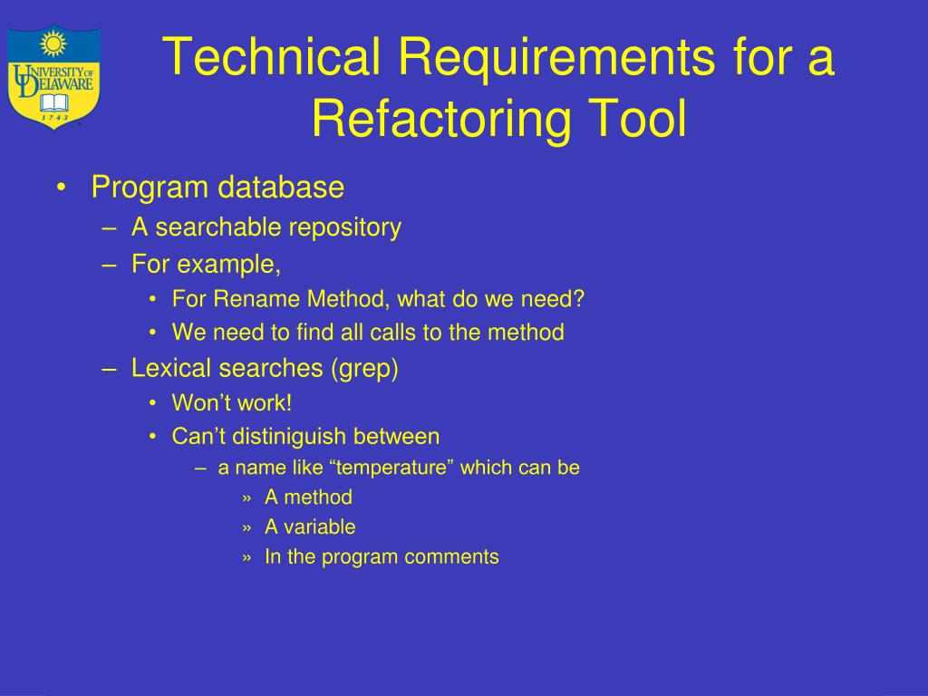 Technical Requirements for a Refactoring Tool Program database A searchable repository For example, For Rename Method, what do we need? We need to find all calls to the method Lexical searches (grep) Won’t work! Can’t distiniguish between a name like “temperature” which can be A method A variable In the program comments