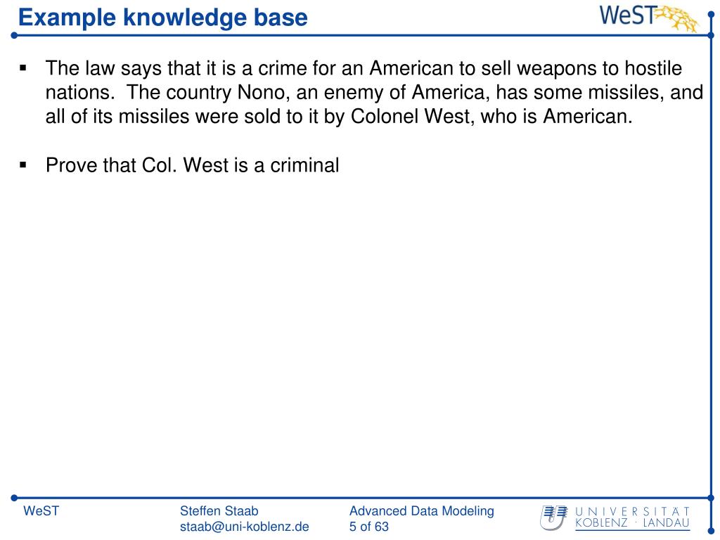 Example knowledge base • The law says that it is a crime for an American to sell weapons to hostile nations. The country Nono, an enemy of America, has some missiles, and all of its missiles were sold to it by Colonel West, who is American. • Prove that Col. West is a criminal