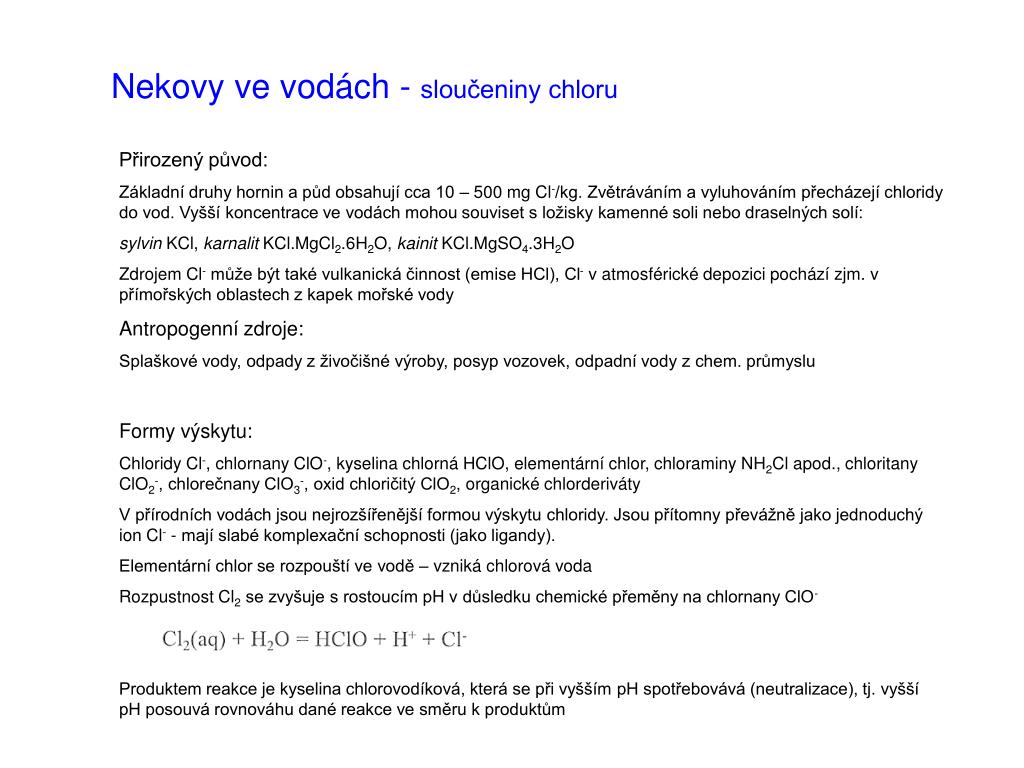 Nekovy ve vodách - sloučeniny chloru Přirozený původ: Základní druhy hornin a půd obsahují cca 10 – 500 mg Cl-/kg. Zvětráváním a vyluhováním přecházejí chloridy do vod. Vyšší koncentrace ve vodách mohou souviset s ložisky kamenné soli nebo draselných solí: sylvin KCl, karnalit KCl.MgCl2.6H2O, kainit KCl.MgSO4.3H2O Zdrojem Cl- může být také vulkanická činnost (emise HCl), Cl- v atmosférické depozici pochází zjm. v přímořských oblastech z kapek mořské vody Antropogenní zdroje: Splaškové vody, odpady z živočišné výroby, posyp vozovek, odpadní vody z chem. průmyslu Formy výskytu: Chloridy Cl-, chlornany ClO-, kyselina chlorná HClO, elementární chlor, chloraminy NH2Cl apod., chloritany ClO2-, chlorečnany ClO3-, oxid chloričitý ClO2, organické chlorderiváty V přírodních vodách jsou nejrozšířenější formou výskytu chloridy. Jsou přítomny převážně jako jednoduchý ion Cl- - mají slabé komplexační schopnosti (jako ligandy). Elementární chlor se rozpouští ve vodě – vzniká chlorová voda Rozpustnost Cl2 se zvyšuje s rostoucím pH v důsledku chemické přeměny na chlornany ClO- Produktem reakce je kyselina chlorovodíková, která se při vyšším pH spotřebovává (neutralizace), tj. vyšší pH posouvá rovnováhu dané reakce ve směru k produktům