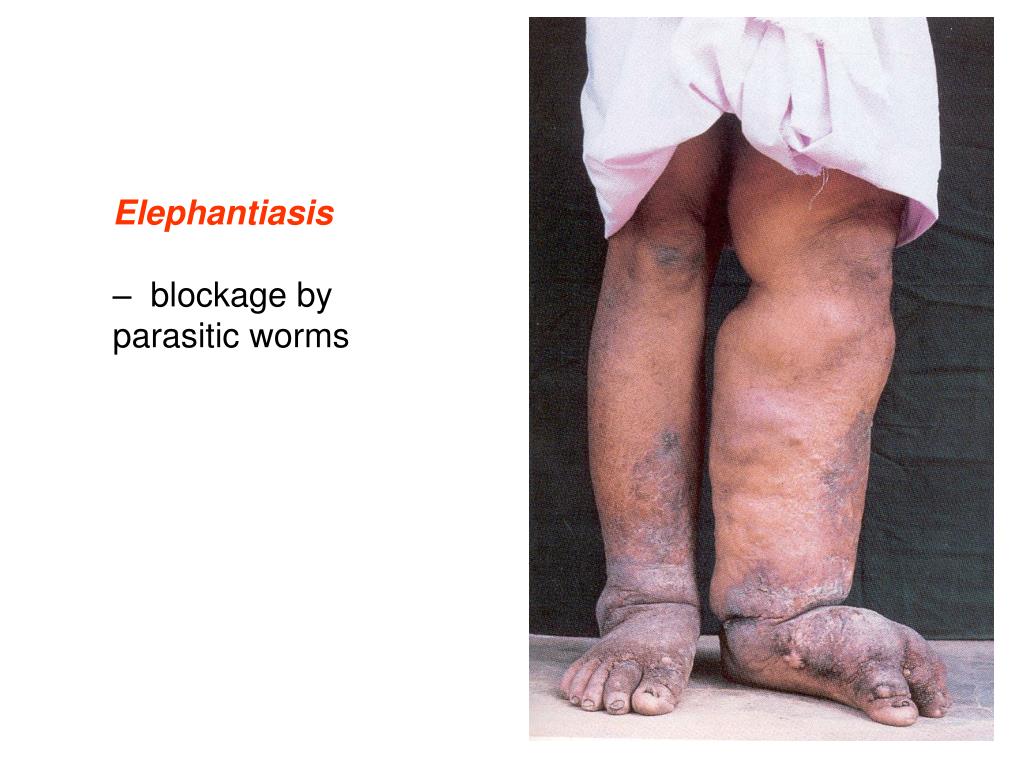 blockage of lymph drainage Lymphedema - swelling in tissues - due to tumor pressure, parasites, or surgery