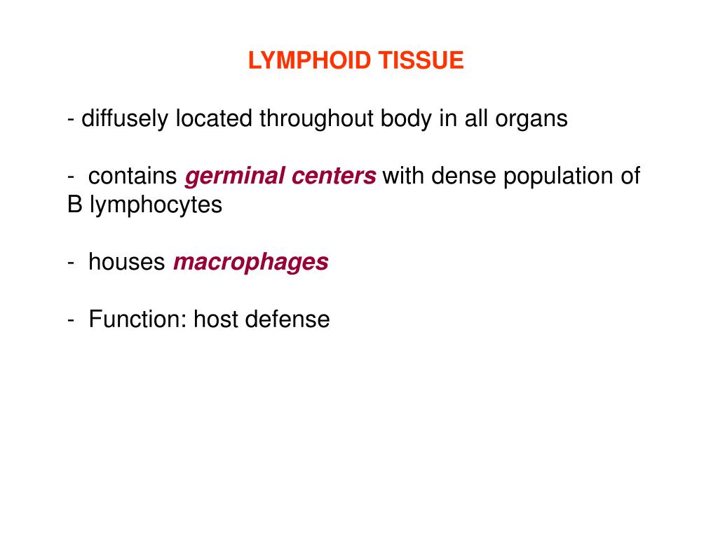 LYMPHOID TISSUE • diffusely located throughout body in all organs • contains germinal centers with dense population of B lymphocytes • houses macrophages • Function: host defense
