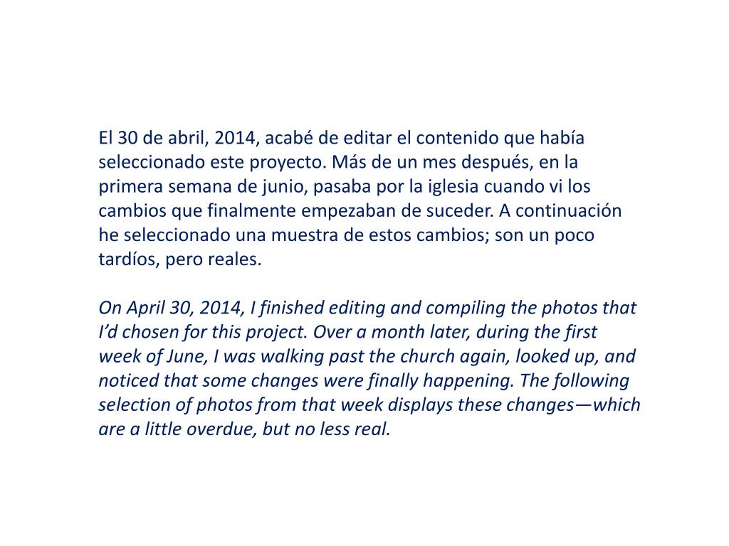 El 30 de abril, 2014, acabé de editar el contenido que había seleccionado este proyecto. Más de un mes después, en la primera semana de junio, pasaba por la iglesia cuando vi los cambios que finalmente empezaban de suceder. A continuación he seleccionado una muestra de estos cambios; son un poco tardíos, pero reales. On April 30, 2014, I finished editing and compiling the photos that I’d chosen for this project. Over a month later, during the first week of June, I was walking past the church again, looked up, and noticed that some changes were finally happening. The following selection of photos from that week displays these changes—which are a little overdue, but no less real.