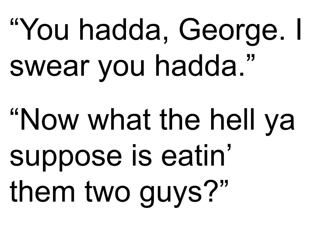 “You hadda, George. I swear you hadda.” “Now what the hell ya suppose is eatin’ them two guys?”