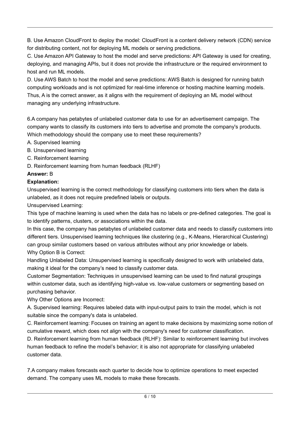 B. Use Amazon CloudFront to deploy the model: CloudFront is a content delivery network (CDN) service for distributing content, not for deploying ML models or serving predictions. C. Use Amazon API Gateway to host the model and serve predictions: API Gateway is used for creating, deploying, and managing APIs, but it does not provide the infrastructure or the required environment to host and run ML models. D. Use AWS Batch to host the model and serve predictions: AWS Batch is designed for running batch computing workloads and is not optimized for real-time inference or hosting machine learning models. Thus, A is the correct answer, as it aligns with the requirement of deploying an ML model without managing any underlying infrastructure. 6.A company has petabytes of unlabeled customer data to use for an advertisement campaign. The company wants to classify its customers into tiers to advertise and promote the company's products. Which methodology should the company use to meet these requirements? A. Supervised learning B. Unsupervised learning C. Reinforcement learning D. Reinforcement learning from human feedback (RLHF) Answer: B Explanation: Unsupervised learning is the correct methodology for classifying customers into tiers when the data is unlabeled, as it does not require predefined labels or outputs. Unsupervised Learning: This type of machine learning is used when the data has no labels or pre-defined categories. The goal is to identify patterns, clusters, or associations within the data. In this case, the company has petabytes of unlabeled customer data and needs to classify customers into different tiers. Unsupervised learning techniques like clustering (e.g., K-Means, Hierarchical Clustering) can group similar customers based on various attributes without any prior knowledge or labels. Why Option B is Correct: Handling Unlabeled Data: Unsupervised learning is specifically designed to work with unlabeled data, making it ideal for the company’s need to classify customer data. Customer Segmentation: Techniques in unsupervised learning can be used to find natural groupings within customer data, such as identifying high-value vs. low-value customers or segmenting based on purchasing behavior. Why Other Options are Incorrect: A. Supervised learning: Requires labeled data with input-output pairs to train the model, which is not suitable since the company's data is unlabeled. C. Reinforcement learning: Focuses on training an agent to make decisions by maximizing some notion of cumulative reward, which does not align with the company's need for customer classification. D. Reinforcement learning from human feedback (RLHF): Similar to reinforcement learning but involves human feedback to refine the model’s behavior; it is also not appropriate for classifying unlabeled customer data. 7.A company makes forecasts each quarter to decide how to optimize operations to meet expected demand. The company uses ML models to make these forecasts. 6 / 10
