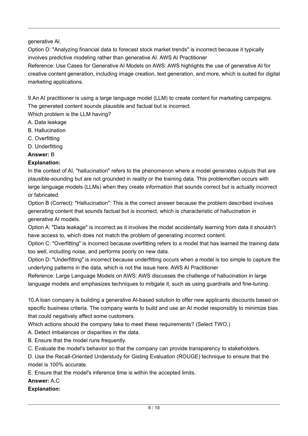 generative AI. Option D: "Analyzing financial data to forecast stock market trends" is incorrect because it typically involves predictive modeling rather than generative AI. AWS AI Practitioner Reference: Use Cases for Generative AI Models on AWS: AWS highlights the use of generative AI for creative content generation, including image creation, text generation, and more, which is suited for digital marketing applications. 9.An AI practitioner is using a large language model (LLM) to create content for marketing campaigns. The generated content sounds plausible and factual but is incorrect. Which problem is the LLM having? A. Data leakage B. Hallucination C. Overfitting D. Underfitting Answer: B Explanation: In the context of AI, "hallucination" refers to the phenomenon where a model generates outputs that are plausible-sounding but are not grounded in reality or the training data. This problemoften occurs with large language models (LLMs) when they create information that sounds correct but is actually incorrect or fabricated. Option B (Correct): "Hallucination": This is the correct answer because the problem described involves generating content that sounds factual but is incorrect, which is characteristic of hallucination in generative AI models. Option A: "Data leakage" is incorrect as it involves the model accidentally learning from data it shouldn't have access to, which does not match the problem of generating incorrect content. Option C: "Overfitting" is incorrect because overfitting refers to a model that has learned the training data too well, including noise, and performs poorly on new data. Option D: "Underfitting" is incorrect because underfitting occurs when a model is too simple to capture the underlying patterns in the data, which is not the issue here. AWS AI Practitioner Reference: Large Language Models on AWS: AWS discusses the challenge of hallucination in large language models and emphasizes techniques to mitigate it, such as using guardrails and fine-tuning. 10.A loan company is building a generative AI-based solution to offer new applicants discounts based on specific business criteria. The company wants to build and use an AI model responsibly to minimize bias that could negatively affect some customers. Which actions should the company take to meet these requirements? (Select TWO.) A. Detect imbalances or disparities in the data. B. Ensure that the model runs frequently. C. Evaluate the model's behavior so that the company can provide transparency to stakeholders. D. Use the Recall-Oriented Understudy for Gisting Evaluation (ROUGE) technique to ensure that the model is 100% accurate. E. Ensure that the model's inference time is within the accepted limits. Answer: A,C Explanation: 8 / 10