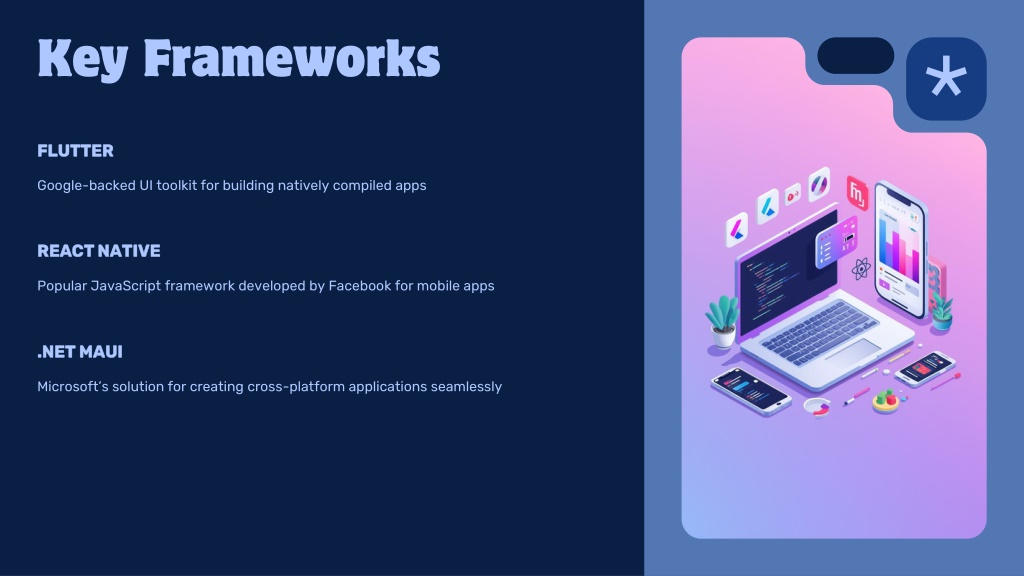FLUTTER • .NET MAUI • REACT NATIVE • Key Frameworks • Google-backed UI toolkit for building natively compiled apps • Microsoft’s solution for creating cross-platform applications seamlessly • Popular JavaScript framework developed by Facebook for mobile apps
