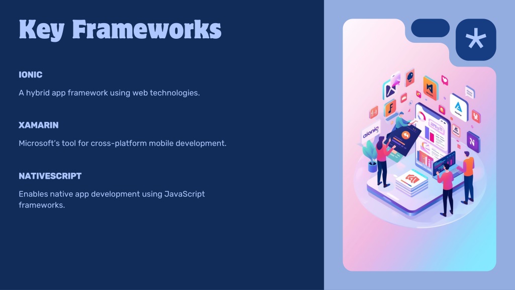 IONIC • NATIVESCRIPT • XAMARIN • Key Frameworks • A hybrid app framework using web technologies. • Enables native app development using JavaScript frameworks. • Microsoft’s tool for cross-platform mobile development.