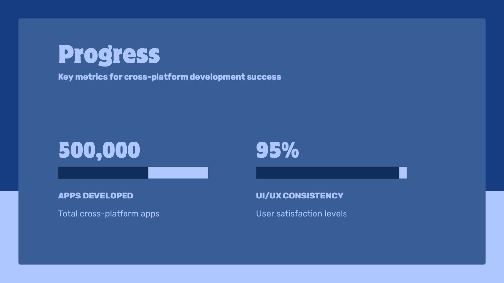 Progress • APPS DEVELOPED • UI/UX CONSISTENCY • Total cross-platform apps • User satisfaction levels • Key metrics for cross-platform development success • 500,000 • 95%