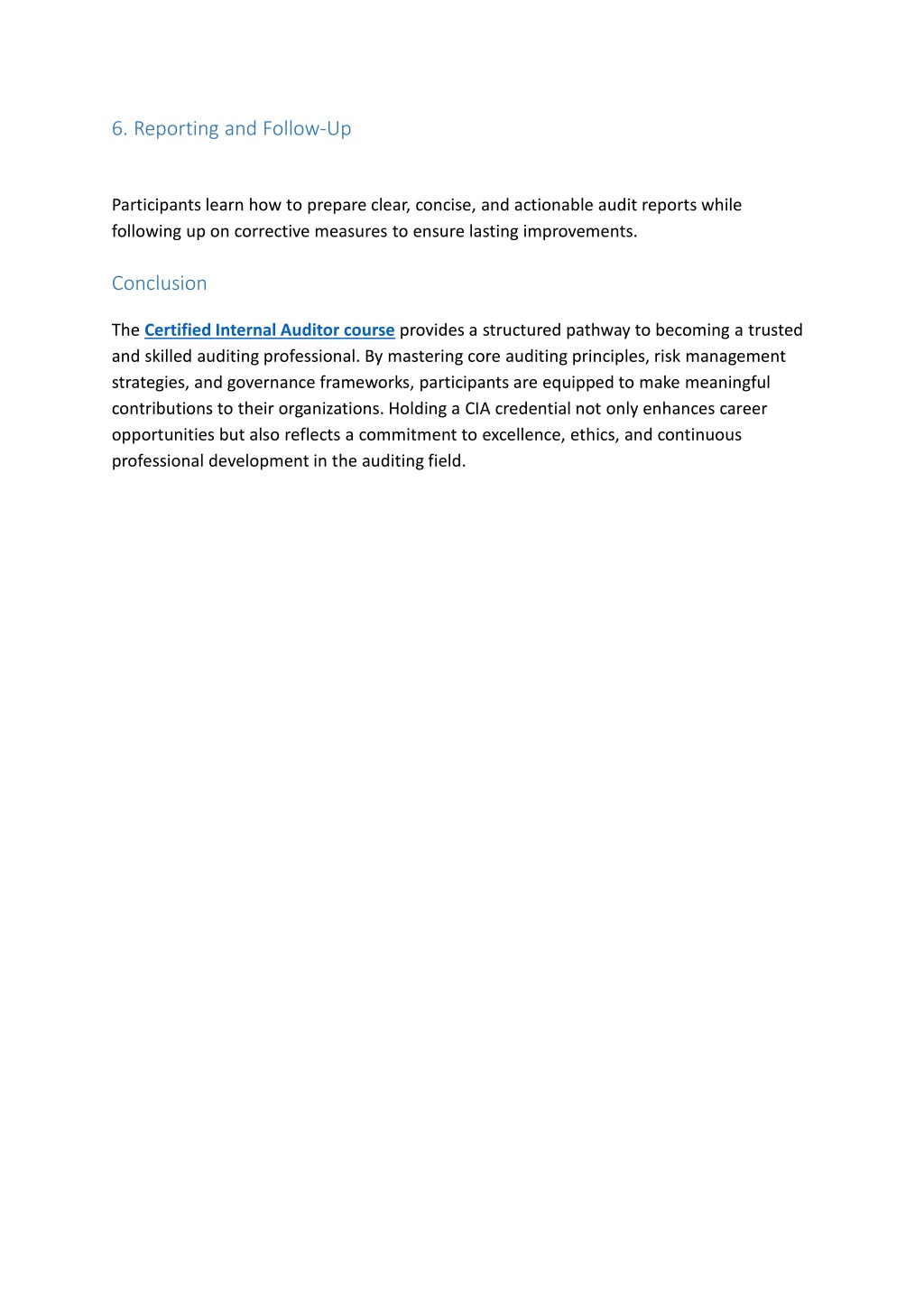 6.ReportingandFollow-Up Participantslearnhowtoprepareclear,concise,andactionableauditreportswhilefollowinguponcorrectivemeasurestoensurelastingimprovements. Conclusion TheCertified Internal Auditor courseprovidesastructuredpathwaytobecomingatrustedandskilledauditingprofessional.Bymasteringcoreauditingprinciples,riskmanagementstrategies,andgovernanceframeworks,participantsareequippedtomakemeaningfulcontributionstotheirorganizations.HoldingaCIAcredentialnotonlyenhancescareeropportunitiesbutalsoreflectsacommitmenttoexcellence,ethics,andcontinuousprofessionaldevelopmentintheauditingfield.