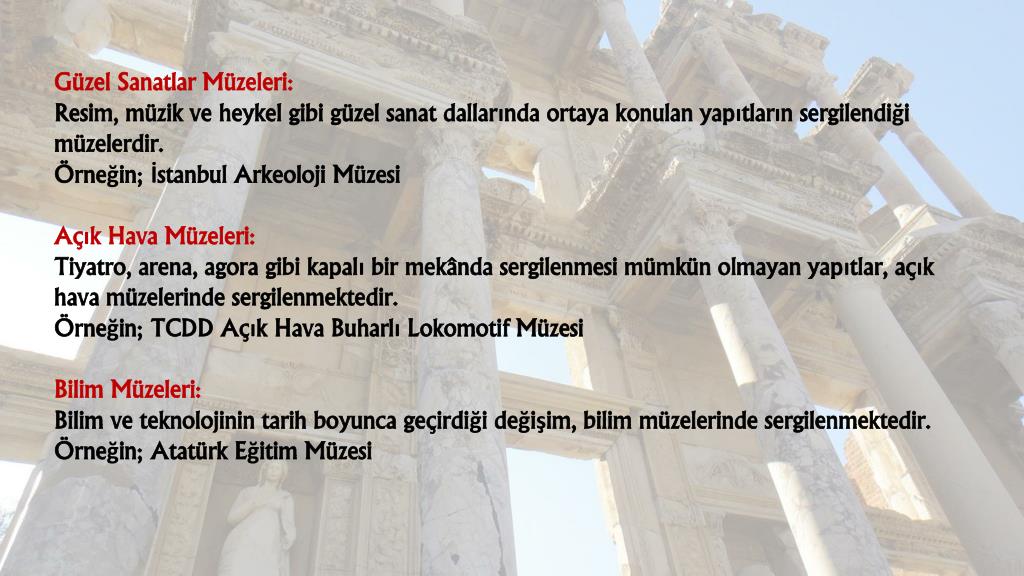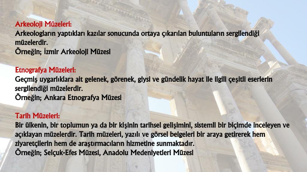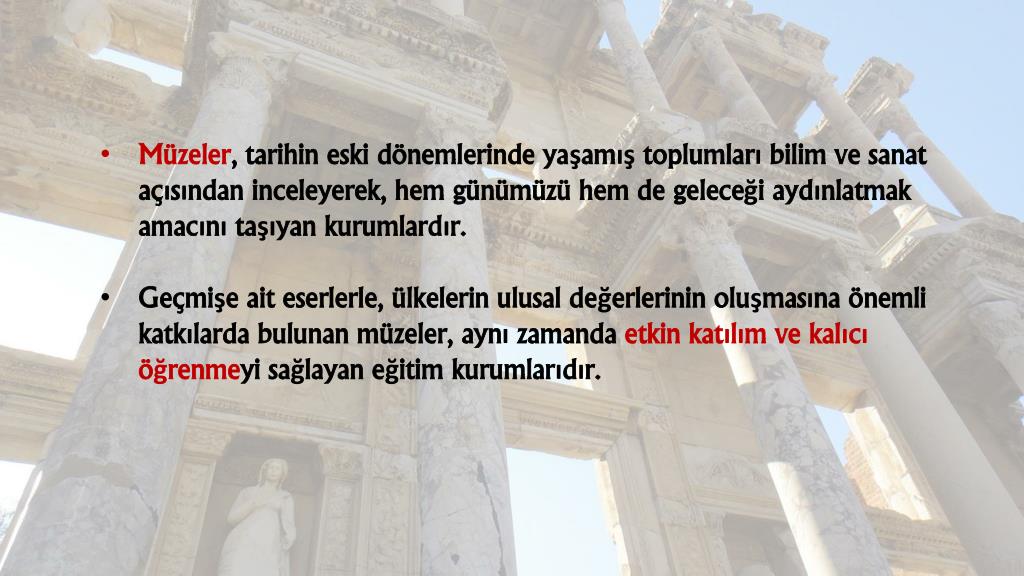 Müzeler, tarihin eski dönemlerinde yaşamış toplumları bilim ve sanat açısından inceleyerek, hem günümüzü hem de geleceği aydınlatmak amacını taşıyan kurumlardır. • Geçmişe ait eserlerle, ülkelerin ulusal değerlerinin oluşmasına önemli katkılarda bulunan müzeler, aynı zamanda etkin katılım ve kalıcı öğrenmeyi sağlayan eğitim kurumlarıdır.