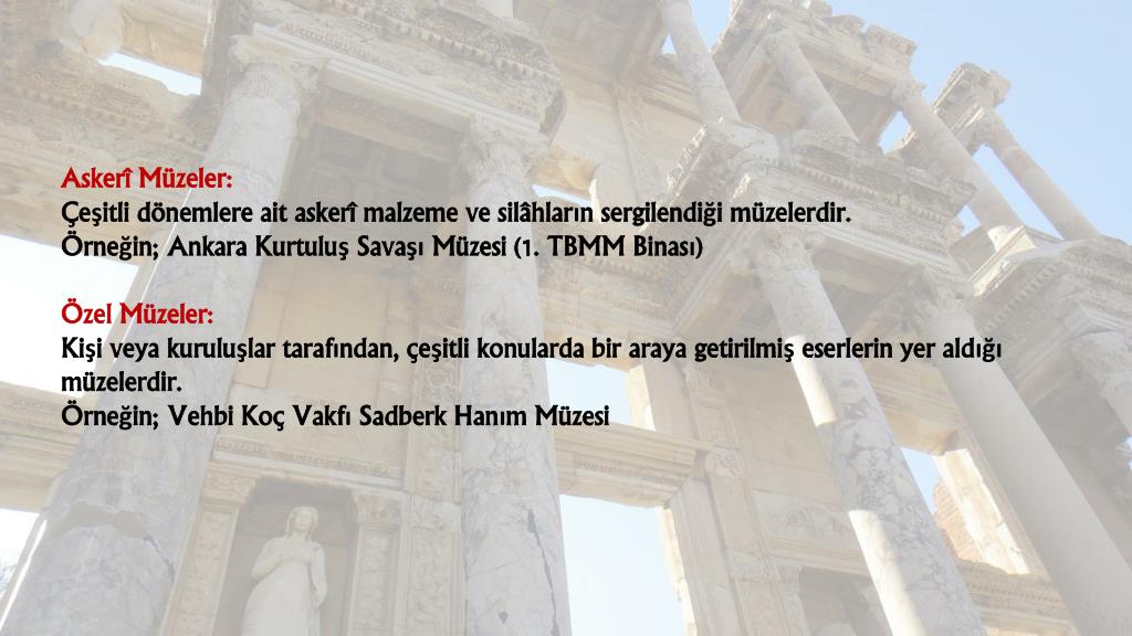 Askerî Müzeler:Çeşitli dönemlere ait askerî malzeme ve silâhların sergilendiği müzelerdir.Örneğin; Ankara Kurtuluş Savaşı Müzesi (1. TBMM Binası)Özel Müzeler:Kişi veya kuruluşlar tarafından, çeşitli konularda bir araya getirilmiş eserlerin yer aldığı müzelerdir.Örneğin; Vehbi Koç Vakfı Sadberk Hanım Müzesi