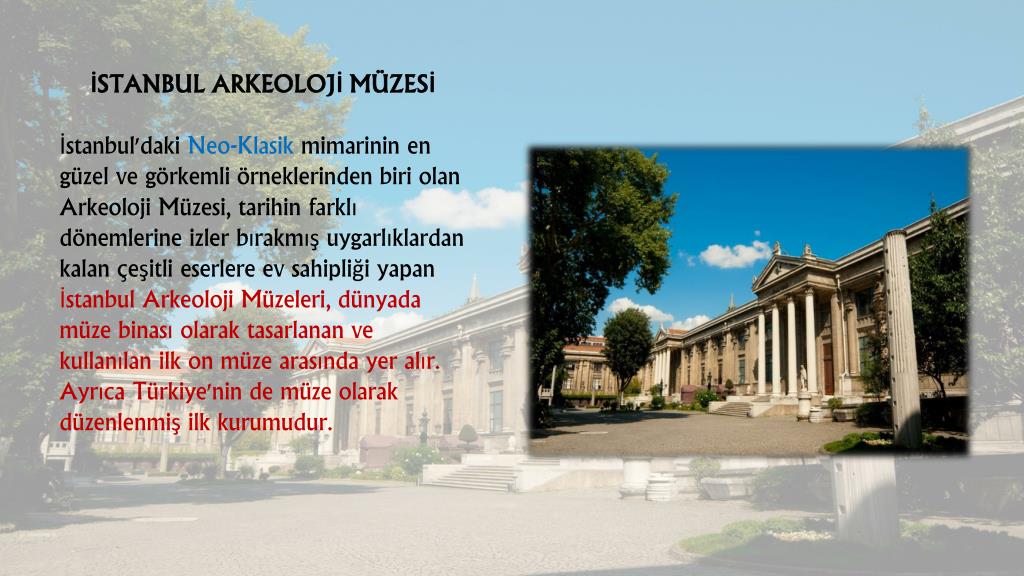 İSTANBUL ARKEOLOJİ MÜZESİ İstanbul'daki Neo-Klasik mimarinin en güzel ve görkemli örneklerinden biri olan Arkeoloji Müzesi, tarihin farklı dönemlerine izler bırakmış uygarlıklardan kalan çeşitli eserlere ev sahipliği yapan İstanbul Arkeoloji Müzeleri, dünyada müze binası olarak tasarlanan ve kullanılan ilk on müze arasında yer alır. Ayrıca Türkiye'nin de müze olarak düzenlenmiş ilk kurumudur.