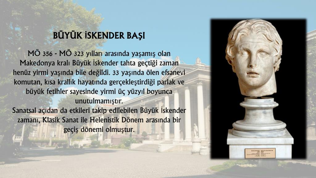 BÜYÜK İSKENDER BAŞI MÖ 356 - MÖ 323 yılları arasında yaşamış olan Makedonya kralı Büyük İskender tahta geçtiği zaman henüz yirmi yaşında bile değildi. 33 yaşında ölen efsanevi komutan, kısa krallık hayatında gerçekleştirdiği parlak ve büyük fetihler sayesinde yirmi üç yüzyıl boyunca unutulmamıştır. Sanatsal açıdan da etkileri takip edilebilen Büyük İskender zamanı, Klasik Sanat ile Helenistik Dönem arasında bir geçiş dönemi olmuştur.