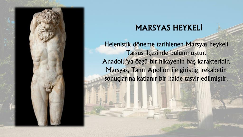 MARSYAS HEYKELİ Helenistik döneme tarihlenen Marsyas heykeli Tarsus ilçesinde bulunmuştur. Anadolu'ya özgü bir hikayenin baş karakteridir. Marsyas, Tanrı Apollon ile giriştiği rekabetin sonuçlarına katlanır bir halde tasvir edilmiştir.