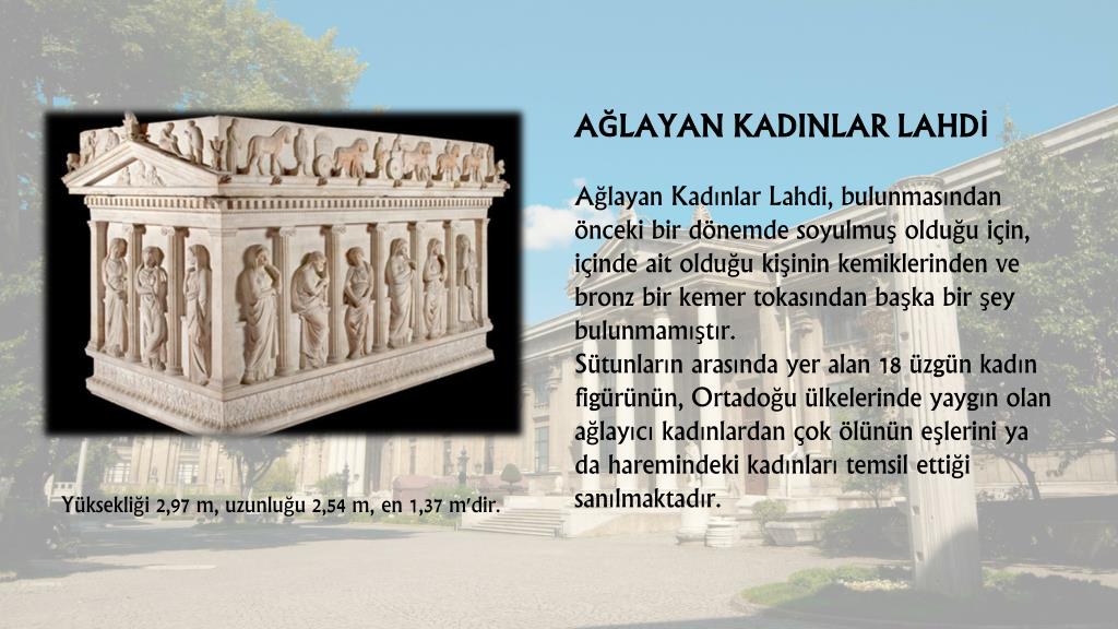 AĞLAYAN KADINLAR LAHDİ Ağlayan Kadınlar Lahdi, bulunmasından önceki bir dönemde soyulmuş olduğu için, içinde ait olduğu kişinin kemiklerinden ve bronz bir kemer tokasından başka bir şey bulunmamıştır. Sütunların arasında yer alan 18 üzgün kadın figürünün, Ortadoğu ülkelerinde yaygın olan ağlayıcı kadınlardan çok ölünün eşlerini ya da haremindeki kadınları temsil ettiği sanılmaktadır. Yüksekliği 2,97 m, uzunluğu 2,54 m, en 1,37 m'dir.