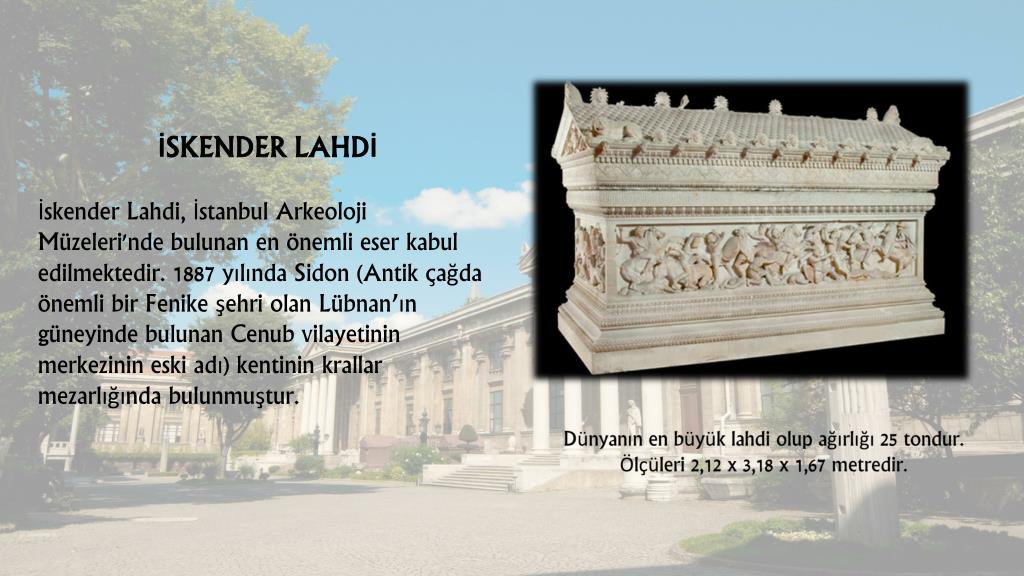 İSKENDER LAHDİ İskender Lahdi, İstanbul Arkeoloji Müzeleri'nde bulunan en önemli eser kabul edilmektedir. 1887 yılında Sidon (Antik çağda önemli bir Fenike şehri olan Lübnan’ın güneyinde bulunan Cenub vilayetinin merkezinin eski adı) kentinin krallar mezarlığında bulunmuştur.