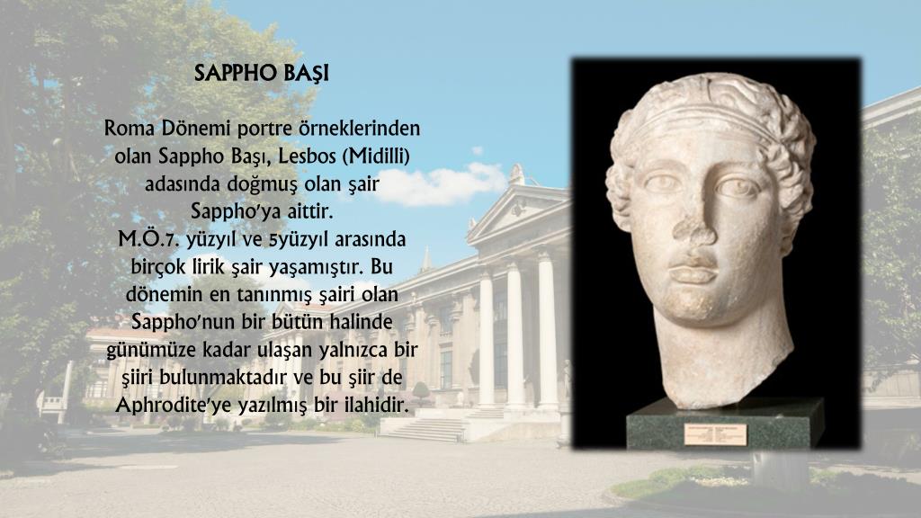 SAPPHO BAŞI Roma Dönemi portre örneklerinden olan Sappho Başı, Lesbos (Midilli) adasında doğmuş olan şair Sappho'ya aittir. M.Ö.7. yüzyıl ve 5yüzyıl arasında birçok lirik şair yaşamıştır. Bu dönemin en tanınmış şairi olan Sappho'nun bir bütün halinde günümüze kadar ulaşan yalnızca bir şiiri bulunmaktadır ve bu şiir de Aphrodite'ye yazılmış bir ilahidir.