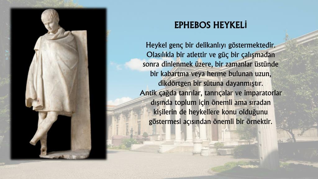 EPHEBOS HEYKELİ Heykel genç bir delikanlıyı göstermektedir. Olasılıkla bir atlettir ve güç bir çalışmadan sonra dinlenmek üzere, bir zamanlar üstünde bir kabartma veya herme bulunan uzun, dikdörtgen bir sütuna dayanmıştır. Antik çağda tanrılar, tanrıçalar ve imparatorlar dışında toplum için önemli ama sıradan kişilerin de heykellere konu olduğunu göstermesi açısından önemli bir örnektir.