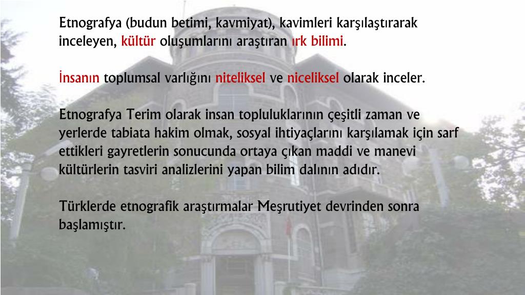 Etnografya (budun betimi, kavmiyat), kavimleri karşılaştırarak inceleyen, kültür oluşumlarını araştıran ırk bilimi. İnsanın toplumsal varlığını niteliksel ve nicelikselolarak inceler. Etnografya Terim olarak insan topluluklarının çeşitli zaman ve yerlerde tabiata hakim olmak, sosyal ihtiyaçlarını karşılamak için sarf ettikleri gayretlerin sonucunda ortaya çıkan maddi ve manevi kültürlerin tasviri analizlerini yapan bilim dalının adıdır. Türklerde etnografikaraştırmalar Meşrutiyet devrinden sonra başlamıştır.