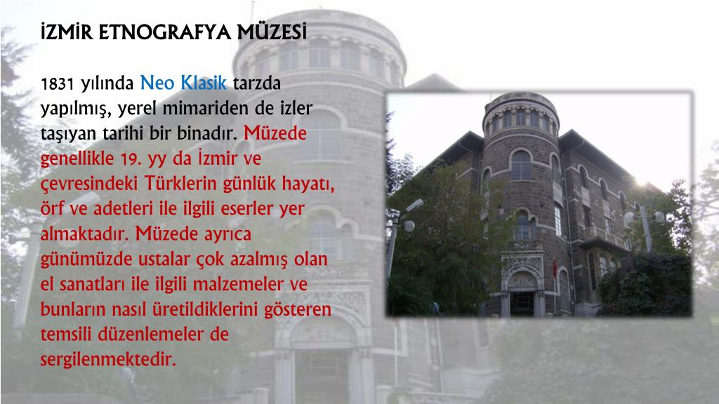 İZMİR ETNOGRAFYA MÜZESİ 1831 yılında Neo Klasik tarzda yapılmış, yerel mimariden de izler taşıyan tarihi bir binadır. Müzede genellikle 19. yy da İzmir ve çevresindeki Türklerin günlük hayatı, örf ve adetleri ile ilgili eserler yer almaktadır. Müzede ayrıca günümüzde ustalar çok azalmış olan el sanatları ile ilgili malzemeler ve bunların nasıl üretildiklerini gösteren temsili düzenlemeler de sergilenmektedir.