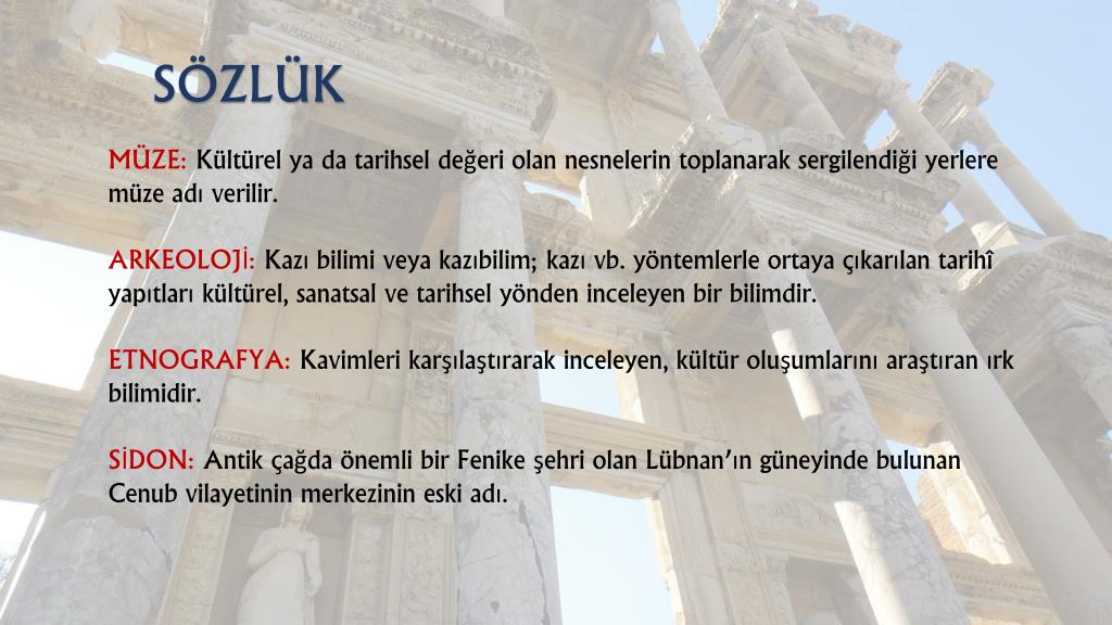 SÖZLÜK MÜZE: Kültürel ya da tarihsel değeri olan nesnelerin toplanarak sergilendiği yerlere müze adı verilir. ARKEOLOJİ: Kazı bilimi veya kazıbilim; kazı vb. yöntemlerle ortaya çıkarılan tarihî yapıtları kültürel, sanatsal ve tarihsel yönden inceleyen bir bilimdir. ETNOGRAFYA: Kavimleri karşılaştırarak inceleyen, kültür oluşumlarını araştıran ırk bilimidir. SİDON: Antik çağda önemli bir Fenike şehri olan Lübnan’ın güneyinde bulunan Cenub vilayetinin merkezinin eski adı.