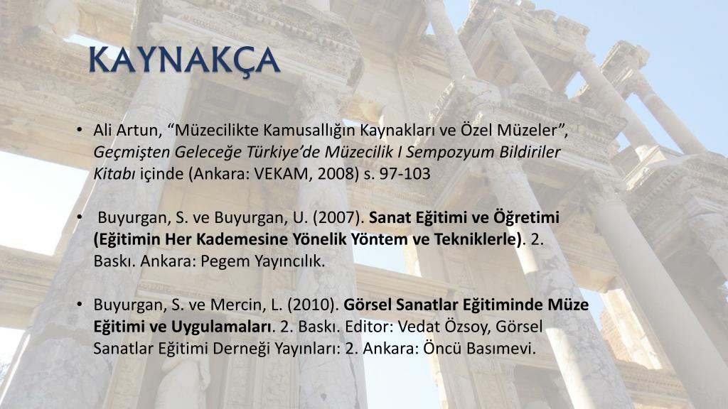 KAYNAKÇA • Ali Artun, “Müzecilikte Kamusallığın Kaynakları ve Özel Müzeler”, Geçmişten Geleceğe Türkiye’de Müzecilik I Sempozyum Bildiriler Kitabı içinde (Ankara: VEKAM, 2008) s. 97-103 • Buyurgan, S. ve Buyurgan, U. (2007). Sanat Eğitimi ve Öğretimi (Eğitimin Her Kademesine Yönelik Yöntem ve Tekniklerle). 2. Baskı. Ankara: Pegem Yayıncılık. • Buyurgan, S. ve Mercin, L. (2010). Görsel Sanatlar Eğitiminde Müze Eğitimi ve Uygulamaları. 2. Baskı. Editor: Vedat Özsoy, Görsel Sanatlar Eğitimi Derneği Yayınları: 2. Ankara: Öncü Basımevi.