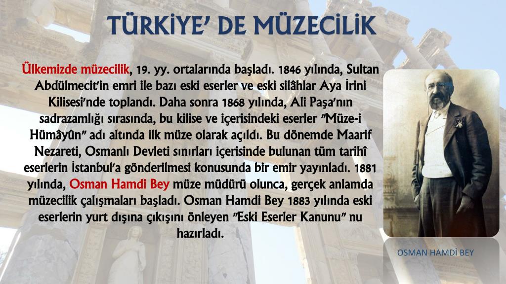 TÜRKİYE’ DE MÜZECİLİK Ülkemizde müzecilik, 19. yy. ortalarında başladı. 1846 yılında, Sultan Abdülmecit'in emri ile bazı eski eserler ve eski silâhlar Aya İrini Kilisesi'nde toplandı. Daha sonra 1868 yılında, Ali Paşa'nın sadrazamlığı sırasında, bu kilise ve içerisindeki eserler "Müze-i Hümâyûn" adı altında ilk müze olarak açıldı. Bu dönemde Maarif Nezareti, Osmanlı Devleti sınırları içerisinde bulunan tüm tarihî eserlerin İstanbul'a gönderilmesi konusunda bir emir yayınladı. 1881 yılında, Osman Hamdi Bey müze müdürü olunca, gerçek anlamda müzecilik çalışmaları başladı. Osman Hamdi Bey 1883 yılında eski eserlerin yurt dışına çıkışını önleyen "Eski Eserler Kanunu" nu hazırladı. OSMAN HAMDİ BEY