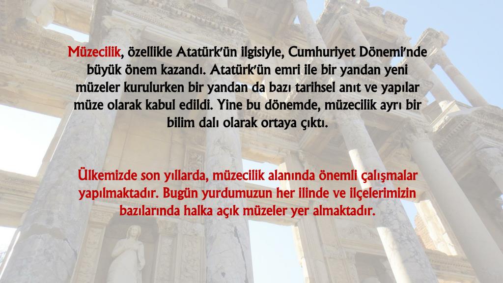 Müzecilik, özellikle Atatürk'ün ilgisiyle, Cumhuriyet Dönemi'nde büyük önem kazandı. Atatürk'ün emri ile bir yandan yeni müzeler kurulurken bir yandan da bazı tarihsel anıt ve yapılar müze olarak kabul edildi. Yine bu dönemde, müzecilik ayrı bir bilim dalı olarak ortaya çıktı. Ülkemizde son yıllarda, müzecilik alanında önemli çalışmalar yapılmaktadır. Bugün yurdumuzun her ilinde ve ilçelerimizin bazılarında halka açık müzeler yer almaktadır.
