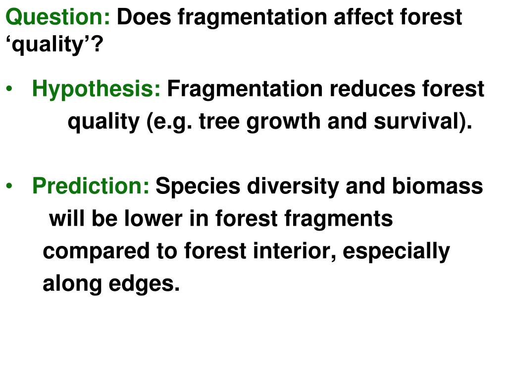 Question: Does fragmentation affect forest ‘quality’? Hypothesis: Fragmentation reduces forest quality (e.g. tree growth and survival). Prediction: Species diversity and biomass will be lower in forest fragments compared to forest interior, especially along edges.