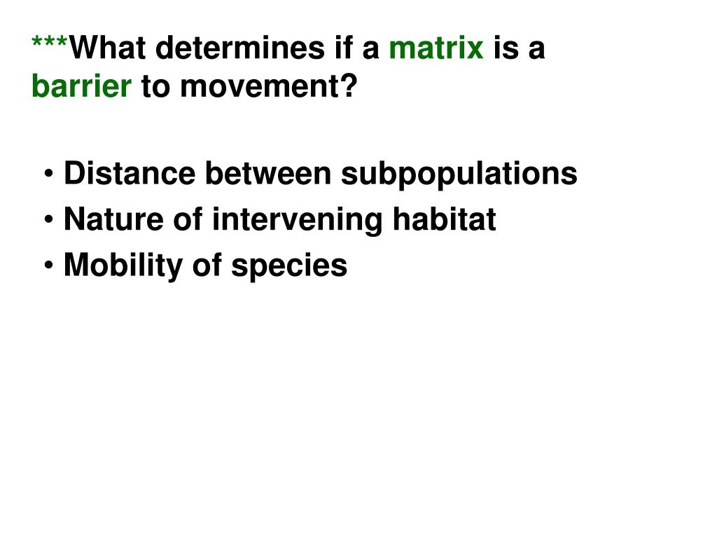 ***What determines if a matrix is a barrier to movement? Distance between subpopulations Nature of intervening habitat Mobility of species