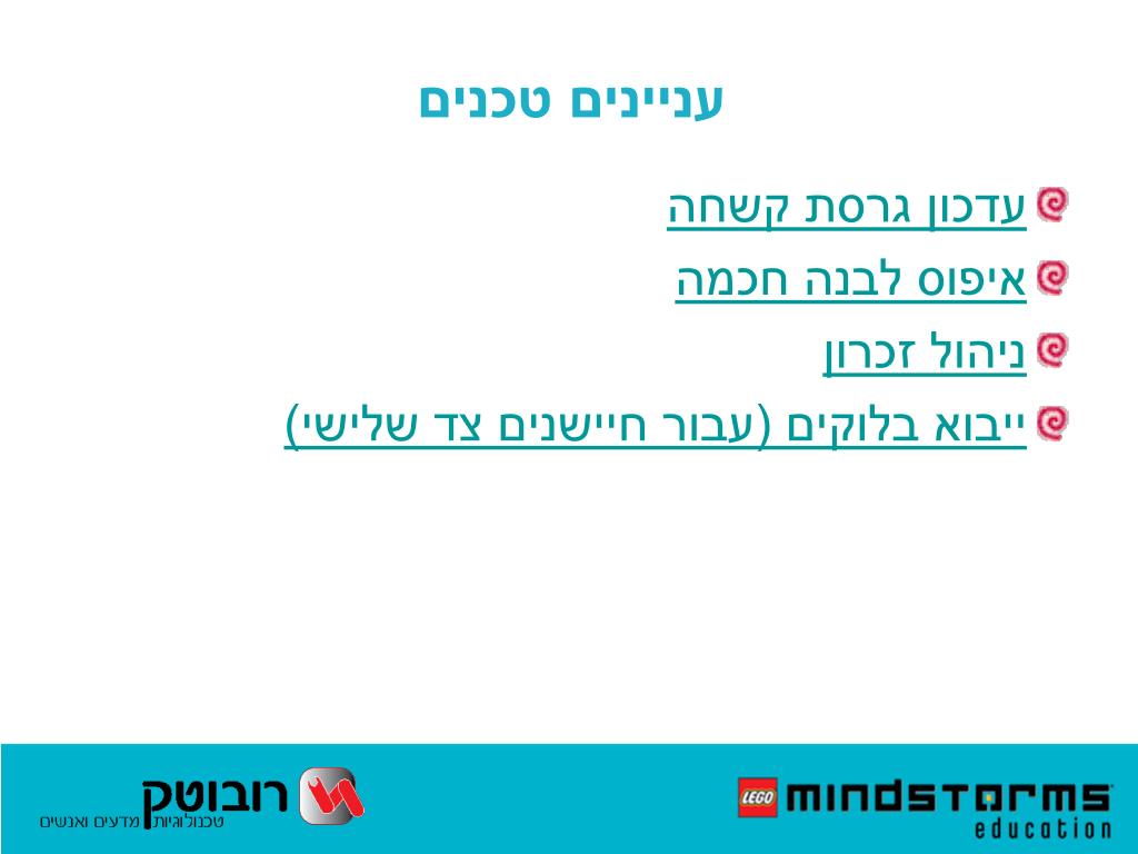 מערכת NXT לרובוטיקה ובקרה ממוחשבת חלק VIII – נספח טכני. עניינים טכנים. עדכון גרסת קשחה איפוס לבנה חכמה ניהול זכרון ייבוא בלוקים (עבור חיישנים צד שלישי). עדכון גרסת קשחה. מהי קשחה?
