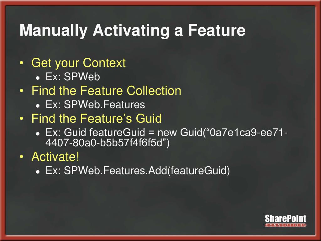 Manually Activating a Feature • Get your Context • Ex: SPWeb • Find the Feature Collection • Ex: SPWeb.Features • Find the Feature’s Guid • Ex: Guid featureGuid = new Guid(“0a7e1ca9-ee71-4407-80a0-b5b57f4f6f5d”) • Activate! • Ex: SPWeb.Features.Add(featureGuid)