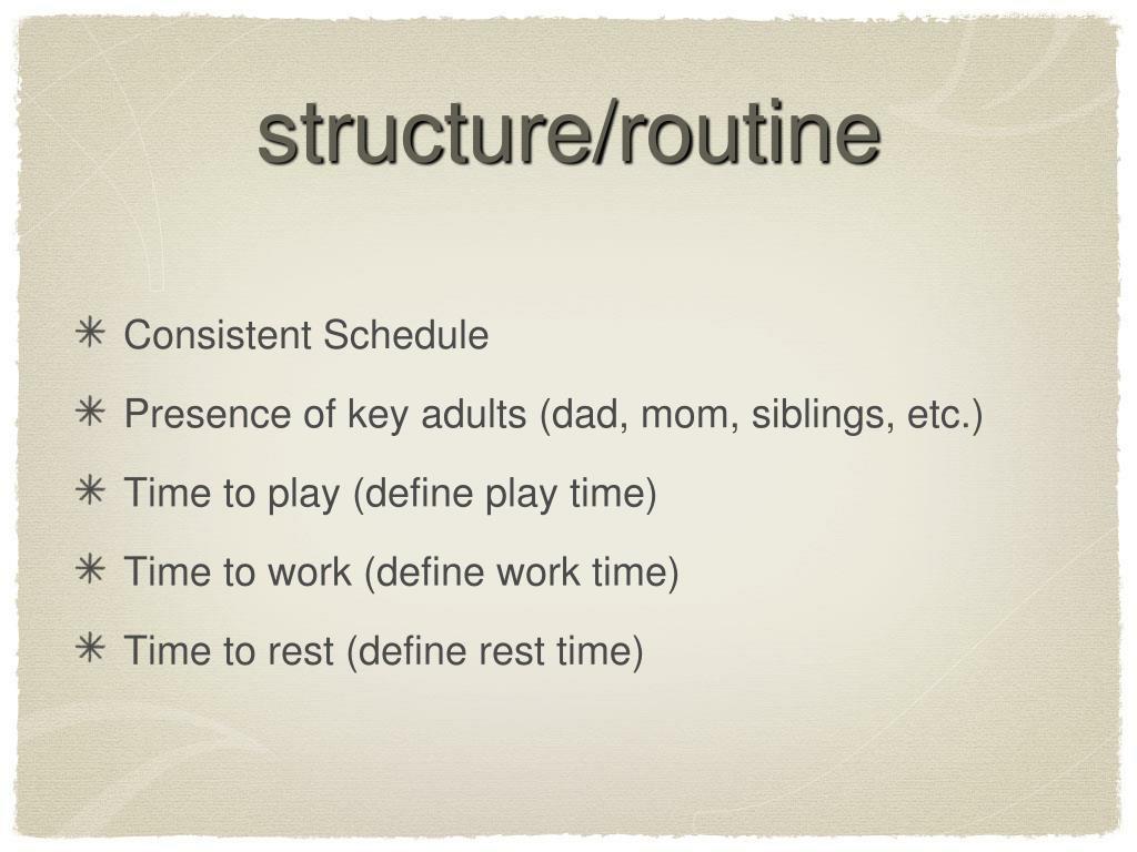 structure/routine • Consistent Schedule • Presence of key adults (dad, mom, siblings, etc.) • Time to play (define play time) • Time to work (define work time) • Time to rest (define rest time)